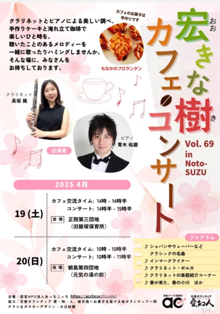 来週4/19-20はピアニストの青木佑磨さんとともに、石川県珠洲市内の2ヵ所の仮設住宅へ伺います!