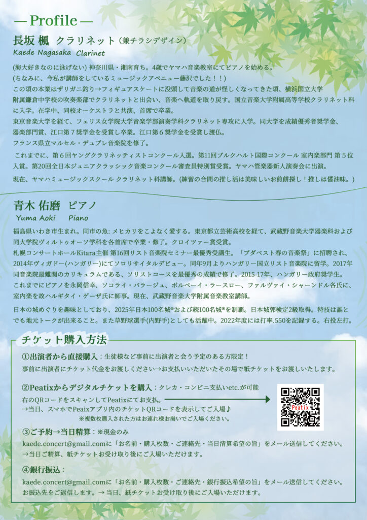 kaede.concert@gmail.comに「お名前・購入枚数・ご連絡先・銀行振込希望の旨」をメール送してください。